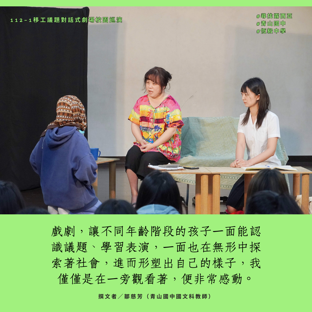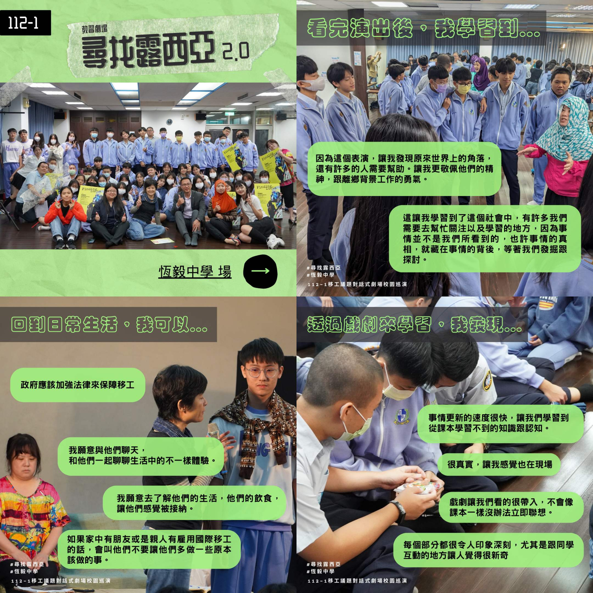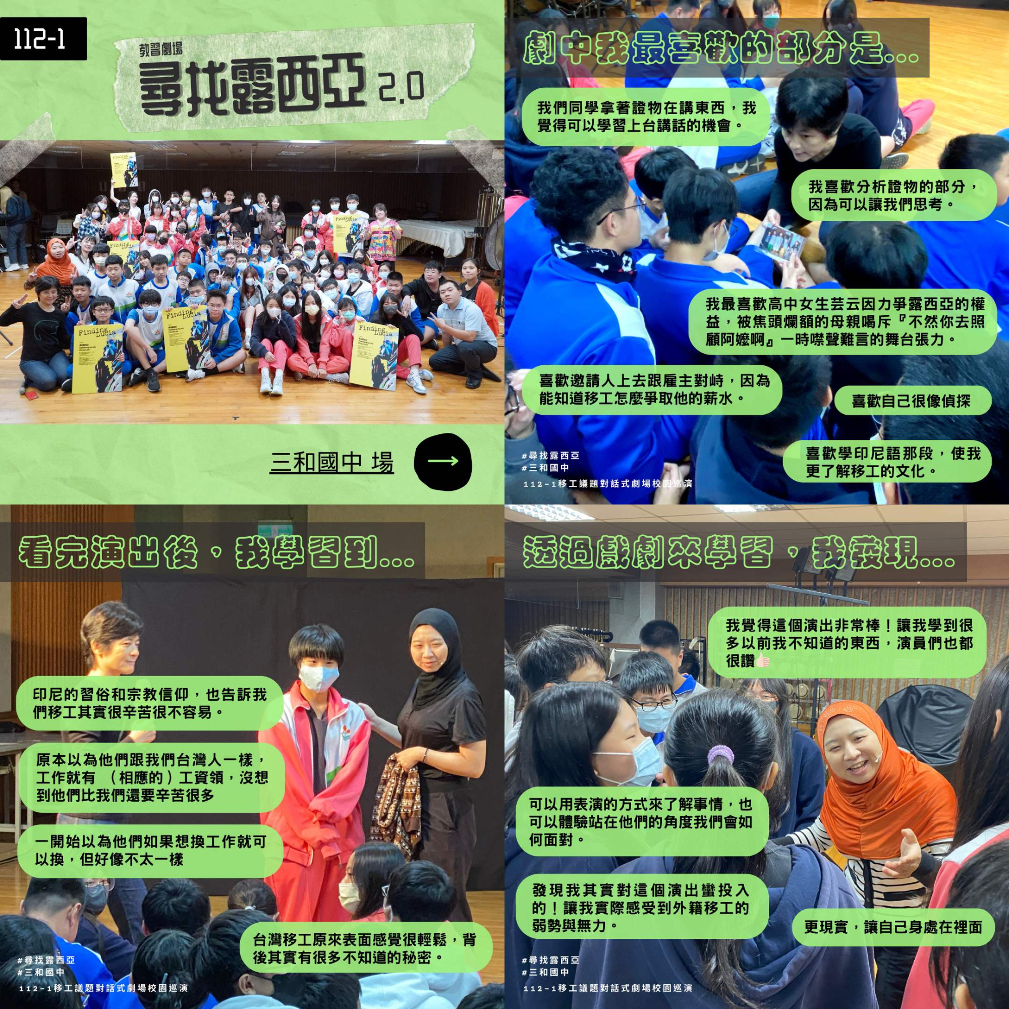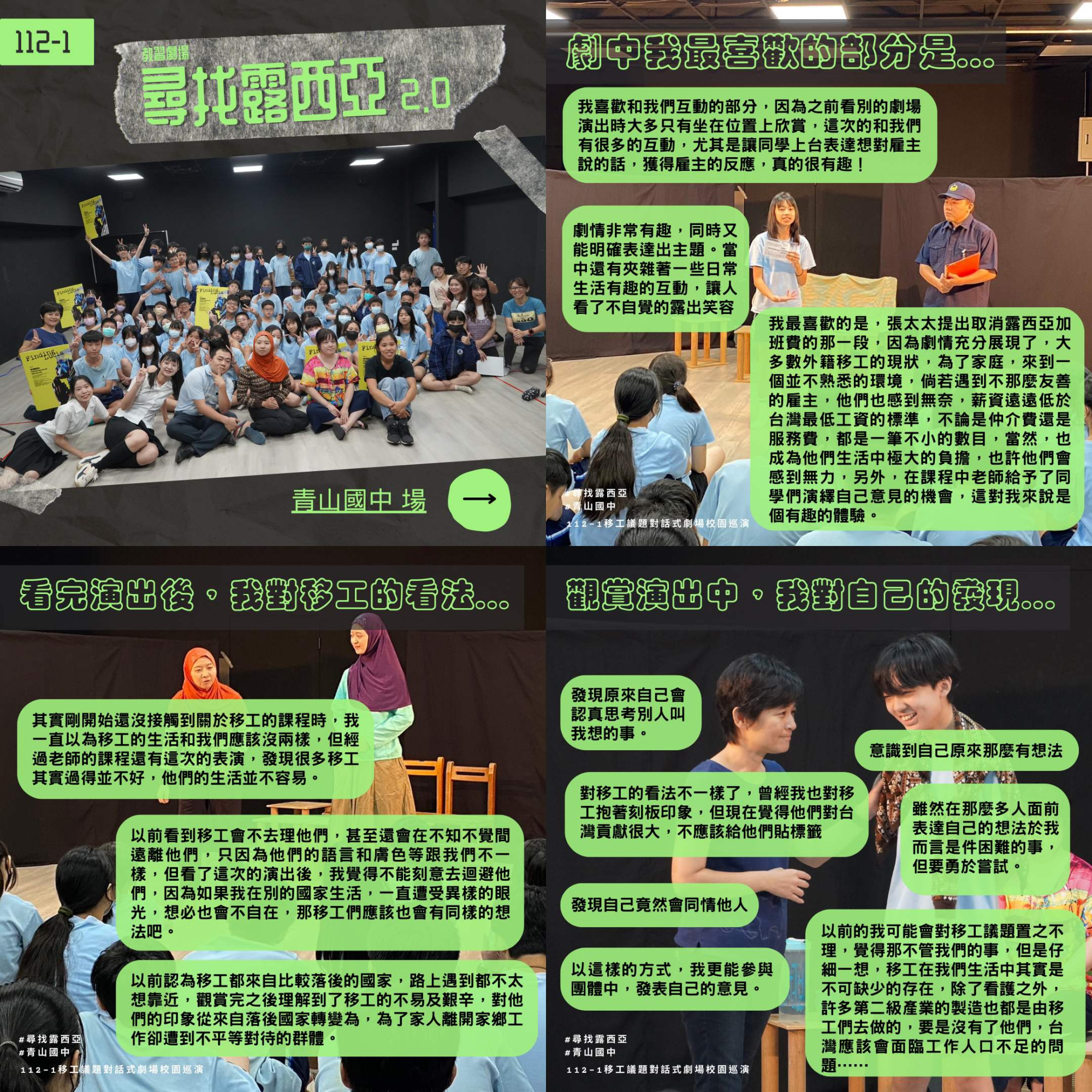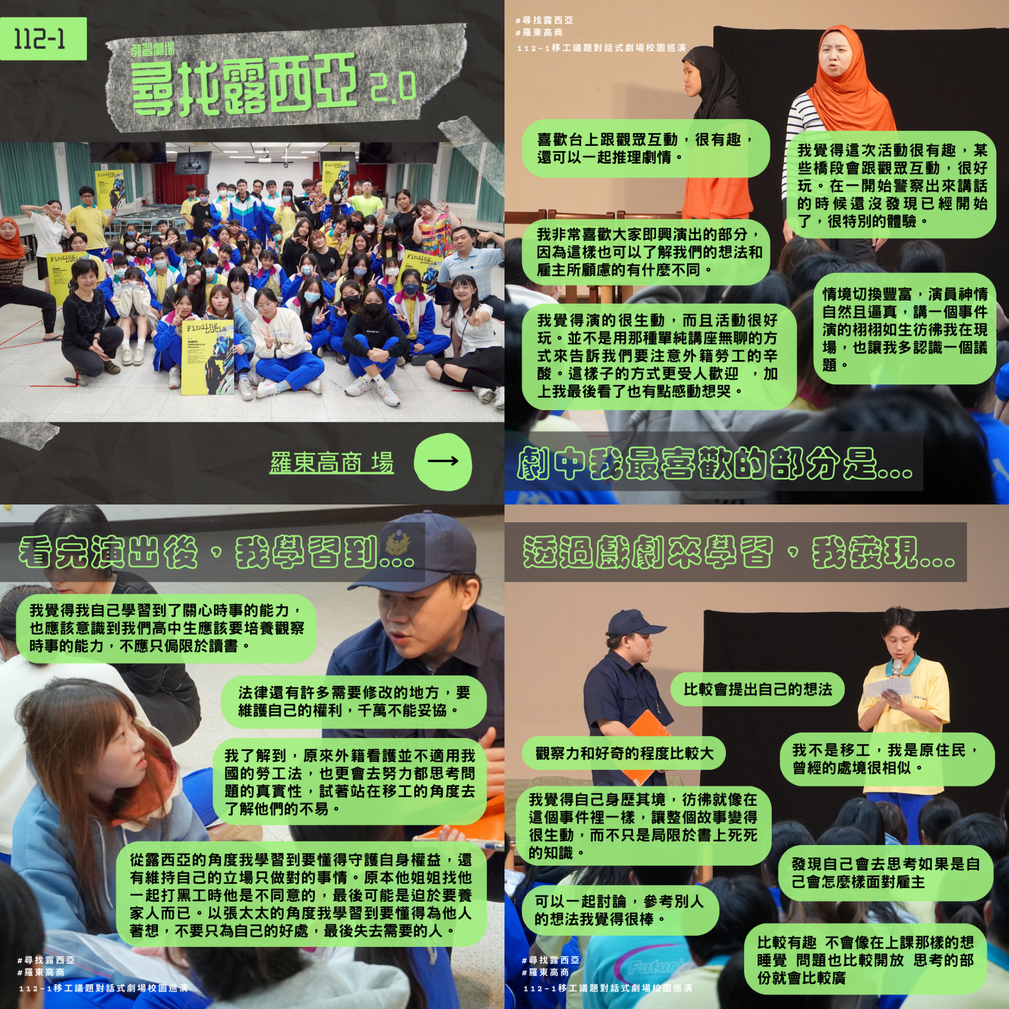 高中職階段的同學們普遍對於公民社會科的「公平正義」概念及法律有較多的知識基礎。當作為丑客的團長淑雅打斷劇情,邀請同學思考,如果他們就是劇中的移工露西亞,會怎麼面對雇主不合理的要求時,便有同學很快地連結到勞動相關法規,假裝在紙條上抄寫勞基法的內容,上台向雇主大聲讀出法條內容,並斥聲控訴種種不合法的勞動條件和要求。